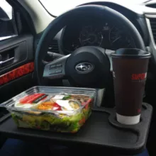 I love this tray! Where I work, days can get hectic to the point where I simply refuse to eat my lunch inside so I go to my car (mental breakaway). I have a sliding armrest/console but it got annoying trying to cut up my hibachi-style teriyaki chicken from Tokyo Grill on it. I did an internet search and found this! No regrets! Note: if you have a steering wheel cover on, this won’t work. Bright side: it’s easy to put on your steering wheel and yes you will doubt yourself and think you can’t apply pressure or you’ll drop your food and drink in your lap, lol. This tray is sturdy enough to cut up food on it! Now, I have to be honest, I only used the “cup holder/placement” feature once.......I prefer the security of my cup holders in my car (‘17 Honda Civic). So where the cup I supposed to go, I put my phone there to watch YouTube while I eat my lunch (propped up by a popsocket). It works perfectly! Oh, and if you put this on your steering wheel and it’s at an angle, just take it off and try again. It’ll happen when you’re trying to put it on in a rush or just aren’t paying attention. :)