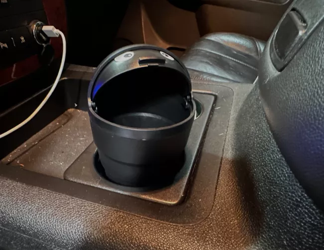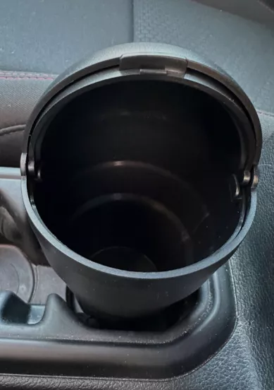 This tiny trash receptacle designed for car cup holders is endearing. Its lid detaches effortlessly for quick disposal. Although it's somewhat diminutive, it perfectly accommodates small trash like gum wrappers and tissues, which are common in my car thanks to my children. Its capacity was humorously tested with about four to five Cutie orange peels by my daughter.