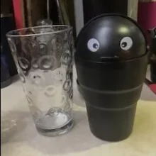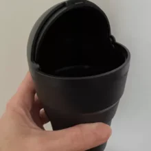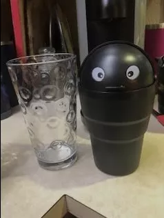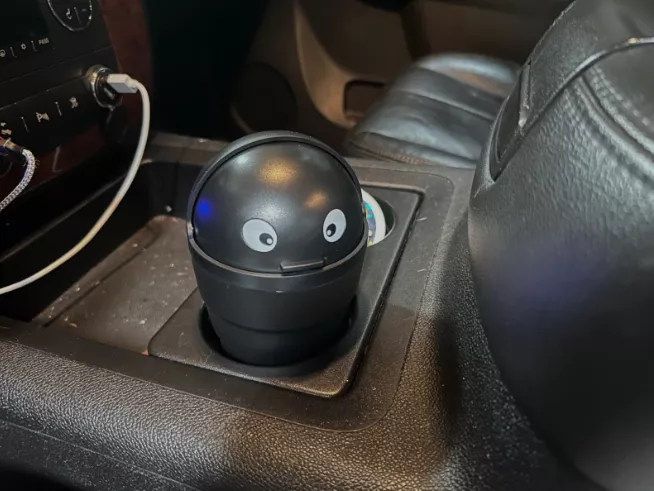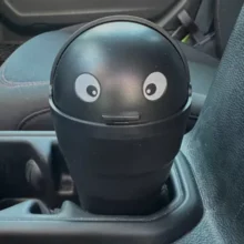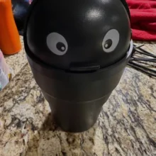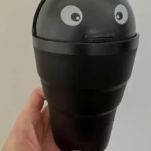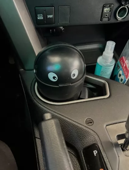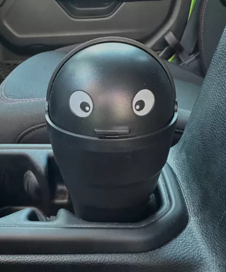 This small plastic container is designed to collect minor trash right in your cup holder. The unique addition of eyes adds a personal flair to this otherwise simple utility item. Its interior is smooth and seamless, making it straightforward to clean. Originally intended for car use, it has found a new home on my office desk, proving its versatility.