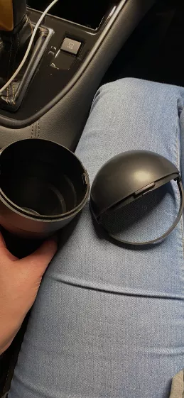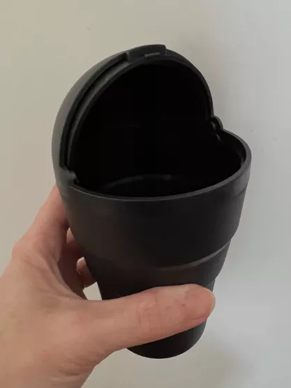 This adorable little bin is just the right size, akin to a 14 oz cup with a domed lid, snugly fitting into a cup holder. It's not only for trash but a convenient spot for anything small. The front opens up smoothly for easy access, and the domed top unscrews for hassle-free cleaning. A quirky and functional addition to any car's cleanliness routine.