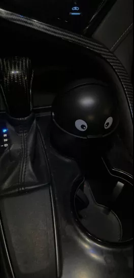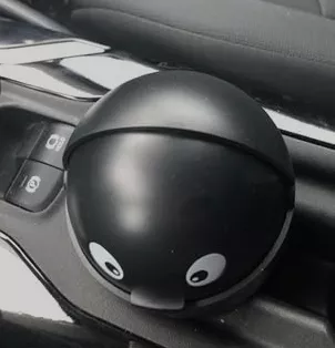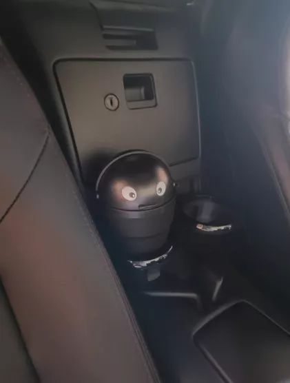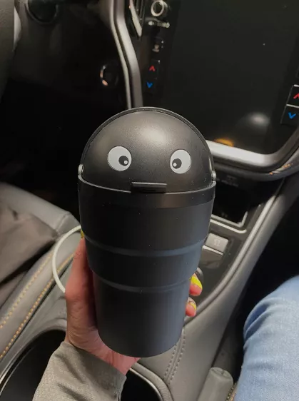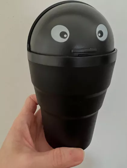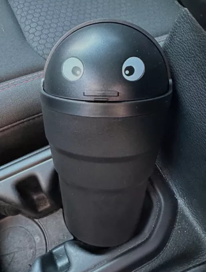 This compact trash bin snugly fits into cup holders, making it perfect for collecting small litter like wrappers and receipts, which usually end up on the car floor. While the eyes aren't as vibrant as expected, they contribute a cute touch. I'm considering enhancing it with googly eyes for added amusement.