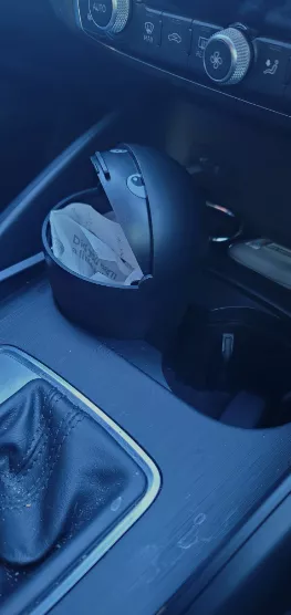 This charming little bin is a perfect fit for my cupholder, making trash disposal effortless with its sliding top. It's light, easy to clean, and ideal for collecting small trash items while keeping potential odors contained under its lid.